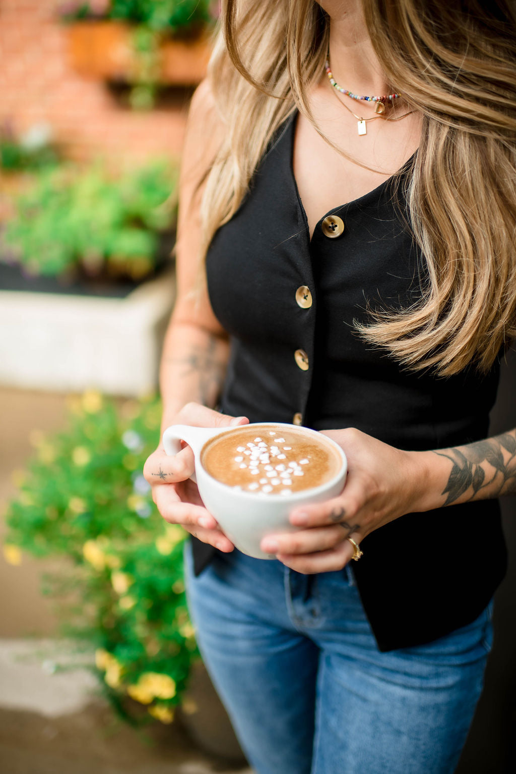 scoop neckline, sleeveless, front button closure, and side welt pockets