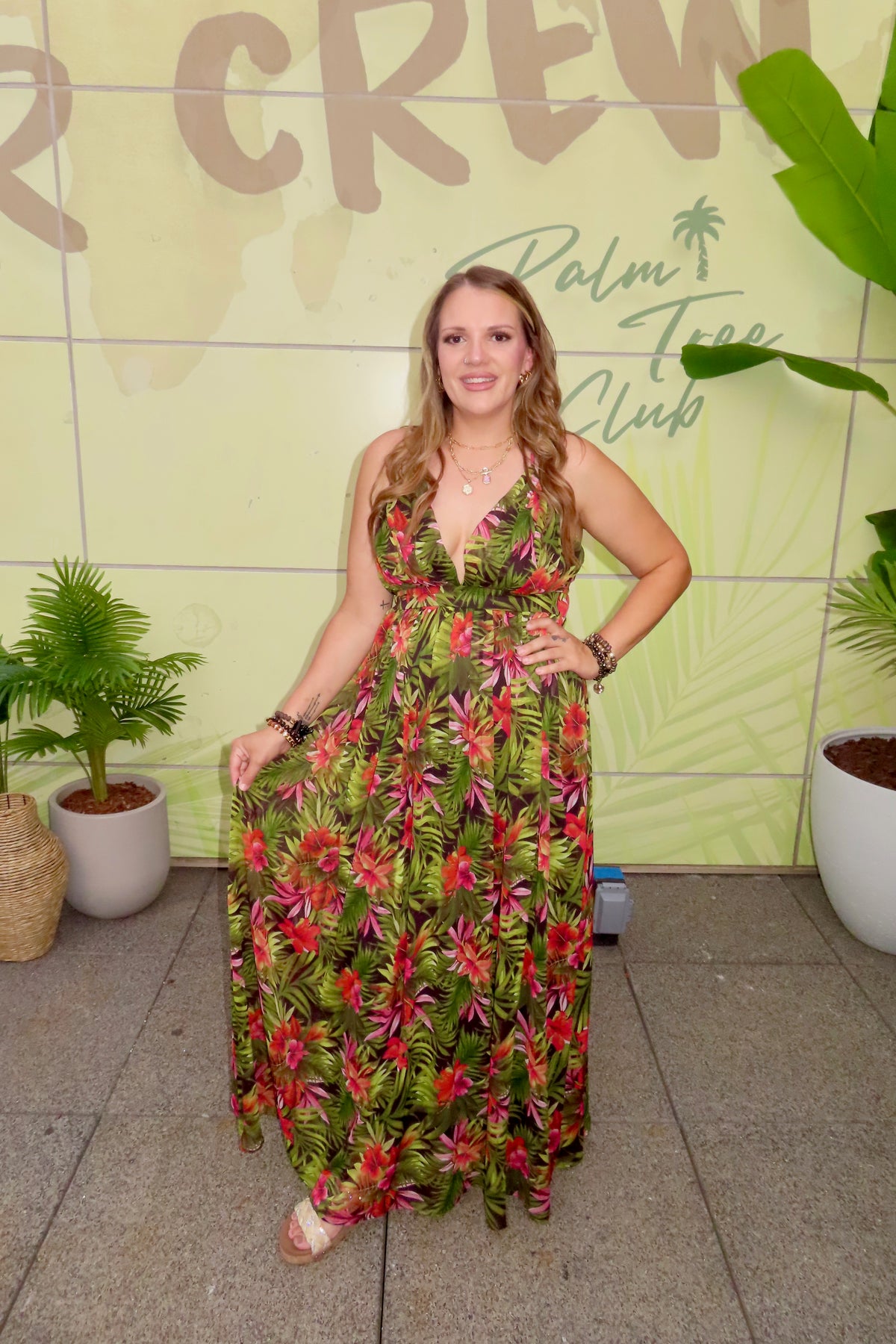 boho maxi dress with plunging neckline, cinched waist, and adjustable straps.