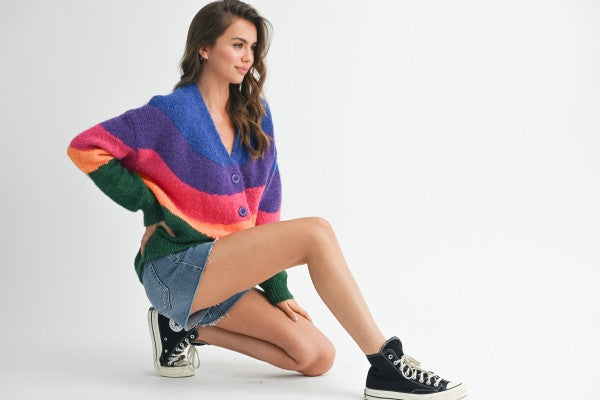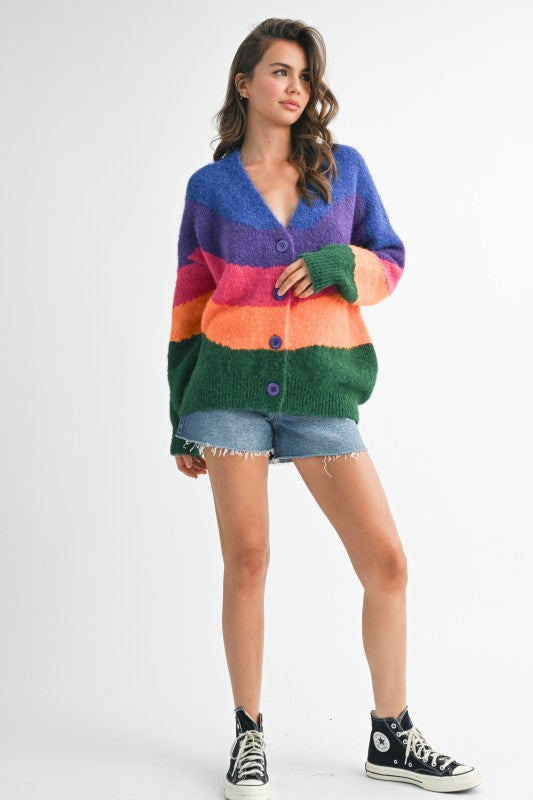 Make a statement in this ultra-soft fuzzy cardigan designed in bold, colorblock stripes. Button it up or wear it open-either way, it's the pop of color your cold-weather wardrobe needs.